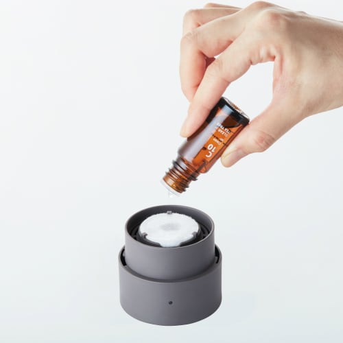 内蔵のオイルパッドに、100%天然エッセンシャルオイルを3〜5滴ほど滴下し、電源ボタンを押してファンを動かしてご使用ください。